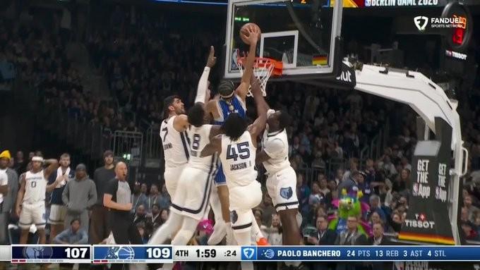 在比赛期间,魔术队后卫安东尼-布莱克贡献了一幅“世界名画”:在末节关键时刻两队战平,布莱克从后场发动一条龙反击,最终他从右路用欧洲步杀入篮下,面对灰熊四名回防球员完成扣篮。